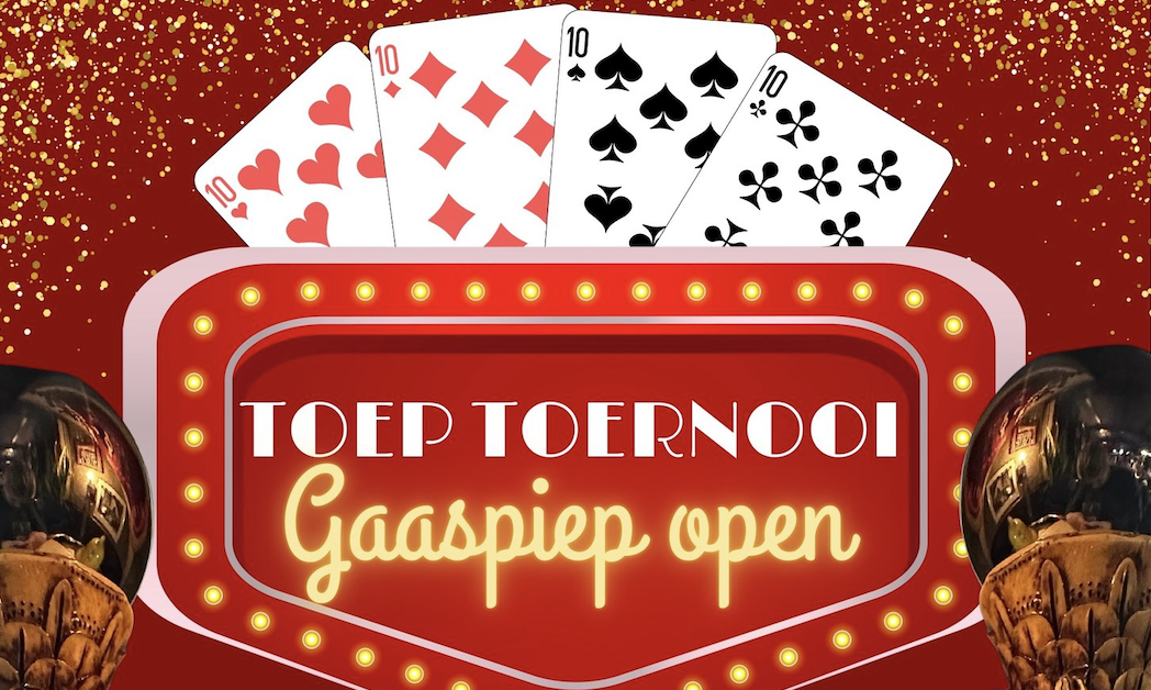 Kaartliefhebbers opgelet: op zondag 12 oktober organiseert Café de Gaaspiep in Venlo een Toep Toernooi. De deuren gaan om 15.00 uur open, waarna om 16.00 uur de eerste kaarten op tafel liggen. Of je nu een ervaren speler bent of gewoon zin hebt in een leuke middag: iedereen is welkom. Meedoen kan door je uiterlijk voor 5 oktober aan te melden (aan de bar), maar ook als toeschouwer ben je verzekerd van een gezellige sfeer. Kom de spelers aanmoedigen, geniet van een goed glas bier en proef de typische kroegsfeer van De Gaaspiep.